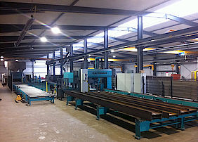Mit der Kaltenbach Bohranlage KDM 1015 in Zusammenhang mit der Säge KBS 1051 DG kann die Firma STAHABAU Stahlprofile bis 1.000mm Breite verarbeiten. In einem Durchgang, werden die Stahlprofile in der Anlage CNC-gesteuert gebohrt, gekörnt und auf Länge gesägt. Dies garantiert dem Kunden eine hohe Passgenauigkeit der Bauteile. Nach der Bearbeitung werden die Profile automatisiert durch die Strahlanlage gefördert. Dies dient zur Befreiung von Rost und Schmutz auf der Oberfläche.